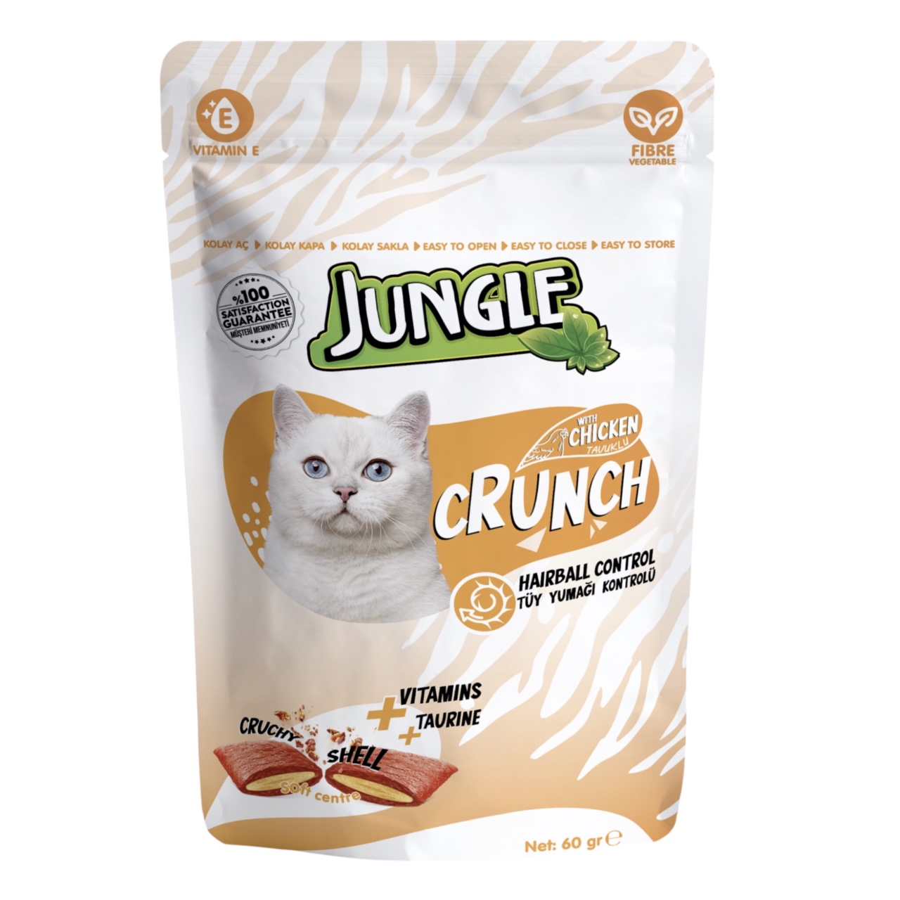 Jungle Crunch Hairball Control Poulet 60 g est une friandise spécialement formulée pour aider à réduire la formation de boules de poils et favoriser la santé digestive de votre chat. Fabriquées à partir de poulet de haute qualité et enrichies en nutriments essentiels, ces friandises croquantes aident à contrôler la formation de boules de poils et favorisent un pelage sain. Chaque paquet contient 60 g, garantissant ainsi des friandises fraîches à chaque fois. C’est l’en-cas idéal pour récompenser votre chat ou pour contribuer à son bien-être.